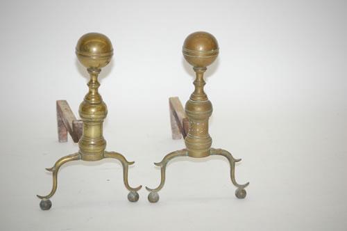 PR. CANNONBALL BRASS ANDIRONS - PERIOD BRASS BALL TOP ANDIRONS W/ PAGODA FEET & IRON DOGS & PEENED (16 1/2" T X 21 1/2" L) - WEAR, OXIDATION & IMPERFECTIONS