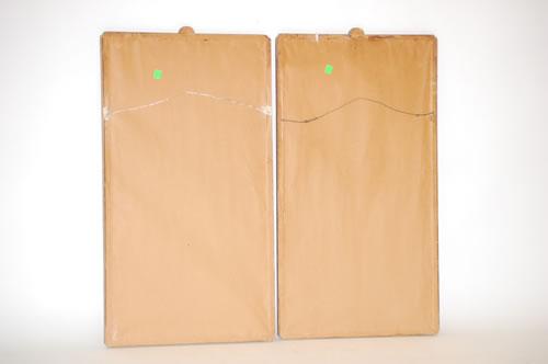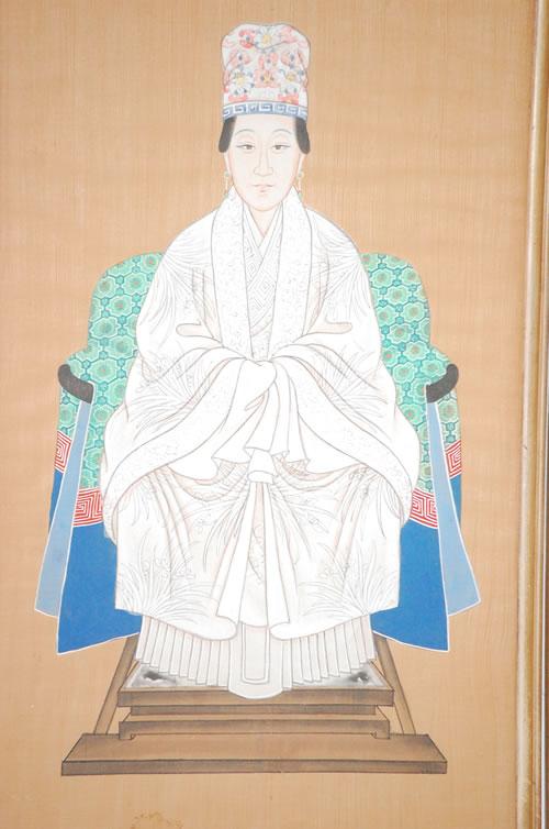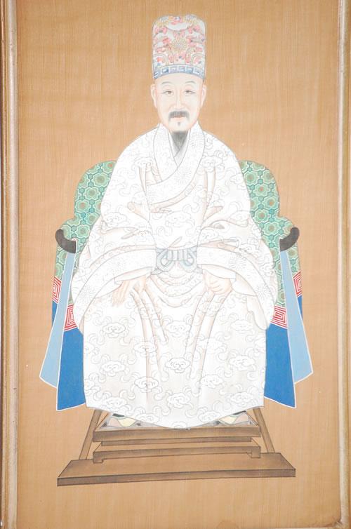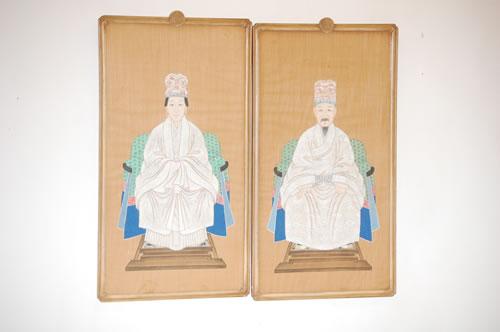 PR. CHINESE WATERCOLOR PAINTINGS - EARLY 20TH CENT. ANCESTOR PORTRAITS OF THRONED ROYALS DRESSED IN MATCHING FINERY ON SPECIALTY PAPER IN CARVED & MOLDED CHINESE MOTIF PAINTED FRAMES (30 1/4" X 16") - WEAR, STAIN, IMPERFECTIONS