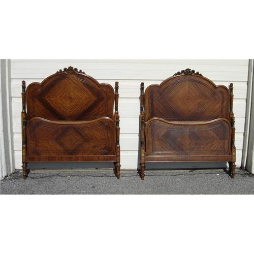 THIS LOVELY PAIR OF WALNUT DECORATED BEDS ARE TWIN SIZE AND IN VERY GOOD CONDITION. THEY ARE FROM THE 1930'S AND HAVE A HEADBOARD AND FOOTBOARD. THE PAINTED DECORATION IS LOVELY. BUYER PAYS FOR INSURED SHIPPING.