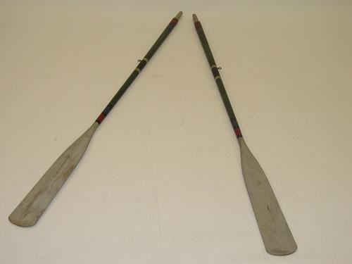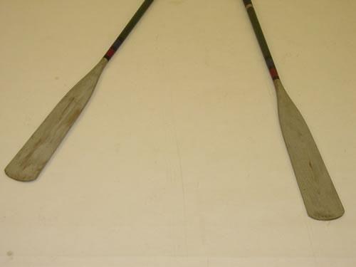 PR. EARLY 20TH CENT. PAINT DECORATED BOAT OARS-GREY PAINTED HANDLES & BLADES W/ GREEN SHAFT & BLACK, RED & BLUE RINGS (83 3/4" L X 5 1/4" W) - WEAR & IMPERFECTIONS