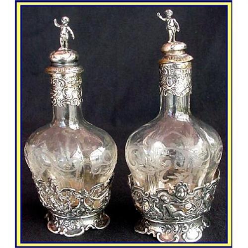 Pair of engraved crystal and silver perfume / scent bottles with Repousse openwork cherubs and putti and cherub putti finials. European, 19th century.<BR>5 3/4inches high.<BR>Bulbous pumpkin lobed glass bodies with hand-engraved scrolls and foliage. The base and neck are covered with 800 silver mounts, rich repousse flowers, foliage and cavorting putti / <BR><BR>cherubs. The corked stoppers/lids have matching silver tops with waving silver cherub finials.<BR>Engraved .800 mark with a flower on one bottle. <BR>Condition is generally excellent. Negligible wear to the silver on the stopper bottoms - magnified in the photos. No chips/cracks/damage of any sort to the glass.