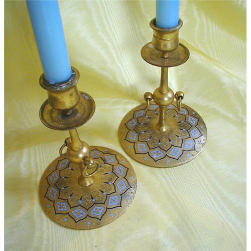 PAIR OF FRENCH LAST QUARTER 19TH CENTURY ENAMEL MOUNTED GILT METAL CANDLESTICKS ~ the candlesticks with loose ring handles and a pattern of exotic blue & black enamel designs on the round bases / One candlestick has no second thin ring in the socket / ( see image ) this in no way affects the candle sitting in the socket. The pair are great looking and very chic. I have shown with blue candles which are lovely with the blue enamel in the base. These are wonderful in any room with blue fabrics.