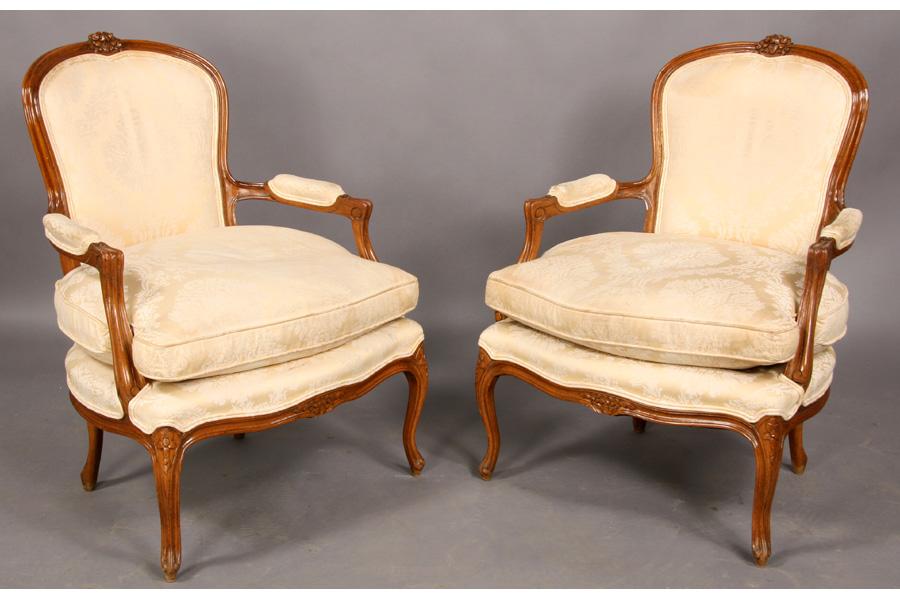 Pair of French Louis XV style arm chairs with carved and arched top over loose down cushions and cabriole legs circa 1960. Ht: 36" Width: 26" Depth: 19" ***PLEASE NOTE: All property shall be paid for by the purchaser within five (5) business days of the sale. Kamelot Auctions accepts cash (In house only), personal checks, certified checks and money orders. We do not accept credit cards or Paypal under any circumstances. Please note our policy regarding payments from International buyers: The only acceptable method of payment is a bank wire/bank transfer. For invoices more than $1000, there is no additional fee for this service. For invoices less than $1000, please include an additional $25 wire fee. We will be happy to forward our bank wiring information after the completion of the auction. Thank you for your understanding and cooperation. All purchases must be removed within 15 business days after an auction. Property not removed from our facility after 15 business days will be moved to an off-site storage facility at a charge of $10.00 per day payable by the buyer. Kamelot does NOT provide shipping services or estimates. However, we recommend the following independent shipping services: Antique Transport Co. at antiquetransport@cs.com, Farren Transport at farrentransport@comcast.net or All Points Shipping at jb@allpointsshippingnj.com for quotations and shipping arrangements for furniture and other large items that would require a blanket wrap shipping company. For quotations and shipping arrangements for smaller items that would traditionally be shipped through UPS, please contact The UPS Store at store4744@theupsstore.com or The Packaging Store at hrpa112@aol.com. Clients are welcome to pick up their items from our location or make their own shipping arrangements.