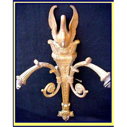 Pair of gilt bronze double wall sconces. 19th century France.<BR>Measure 17 1/4inches long.<BR>Long, tapering back plate with typical French foliage in relief. On either side are curling arms: a flower in the center of the scroll and leaves, petals and columns elegantly adorning them until they end in lights. The sconces have been electrified.<BR>The backplates end in wonderful swans. Long, elegant wings stretch up, fully 3-dimentional, with great detail to feathers and form. Sensuously curving necks double back on themselves and end in open beaks.<BR>The electric part of the sconces should be replaced for American electricity.<BR>The sconces are engraved with a signature on the back:L.H. over 1026 over 1.<BR>Condition is very good.