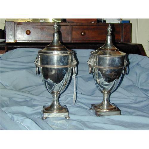 This is a pair of old Sheffield Plate chestnut containers. Each is in the form of an urn with circular handles mounted in the mouth's of lions.