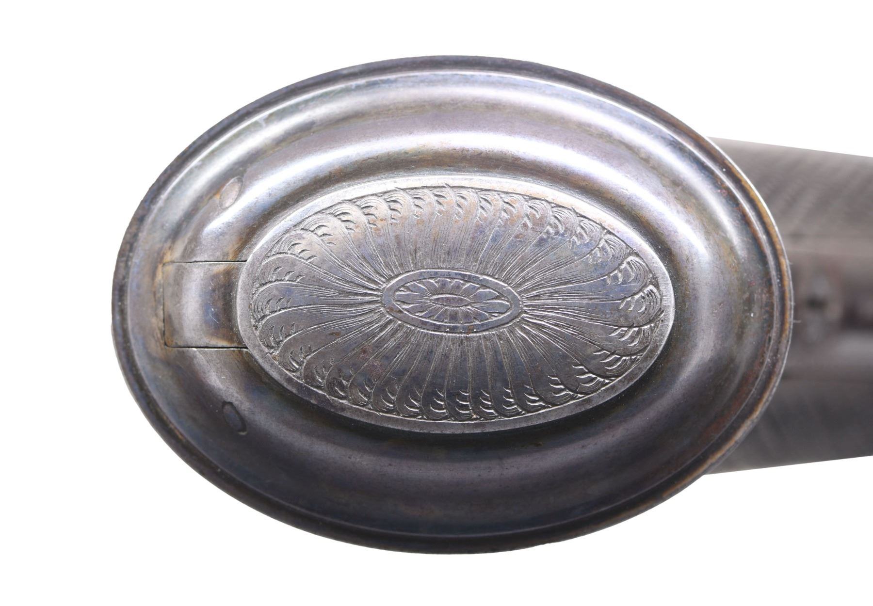 IN VERY FINE ORIGINAL CONDITION. Cal. 65 (both). S# 4046 & 4047 (sold 1845). The 8" damascus barrel sets are engraved "J. Purdey 314 1/2 Oxford Street. London." on narrow top ribs. S#'s and London black powder proofs are on bottoms of barrels and each set is fitted with bridled swiveling steel ramrod. Case hardened breeches are not vented nor do they have blow outs and have platinum lines at rears. Breech irons are engraved with open scroll. Back spring peninsula percussion locks are fitted with round bodied serpentine hammers and have back sliding safetys. Some scroll engraving is on lockplates along with Purdey name and address. Trigger plates have stylized pineapple finials. Trigger guards are engraved with open scroll on bows; S#s are on tangs. Ebonized walnut stocks have flared checkered grips. Grip caps are steel and have feather engraved spring loaded trap covers. Stocks attach to barrels with captive sidebolts through oval silver escutcheons. CONDITION: very fine. Barrels retaining over 90% original dark brown with some high edge wear and a few scratches. Over 70% case hardening color remains on other iron parts, except trigger guards which show over 70% of their bright blue. Stocks are very fine retaining nearly all of their black lacquer finish with a fair number scratches and marks found on both guns. Bores are bright and shiny. Locks are crisp. Safetys work. These guns are listed in the "Early Purdeys" as being extant, sold in 1845, presently in the USA. Donald Dallas in "James Purdey & Sons" relates that 161 double barrel pistols are found in the Purdey records. Consignor states this pair of pistols was made for Sir John Hobhouse, a British politician. (01-26464 & 01-26465/MGM). ANTIQUE. $6,000-10,000.
