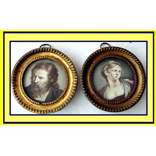 Portraits depict a man and a woman respectively. The full bearded man looks inwards, as though deep in thought. He wears a simple blue robe and has long