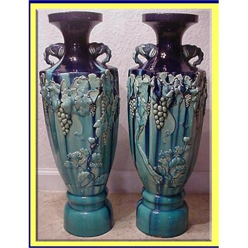 Monumental pair of majolica ceramic vases, made in France, 19th century. Possibly by Theodore Deck and if not, very reminiscent in style. Provenance: The Atlanta Museum.<BR>Each measures 24 1/2 inches high. <BR>Hexagonal panel sides on round stepped base, widen slightly towards shoulders. Fabulous elephant head handles. Glaze ranges from deep, cobalt blue through turquoise to very pale blue. These tones were commonly used by Theodore Deck, as were the elephant handles. The sides are decorated with raised grapes, vineleaves and tendrils towards the top and beautiful Oriental inspired chrysanthemums/peonies towards the bottom. <BR>One vase has been professionally restored near the top. The other vase is in very good condition.<P>