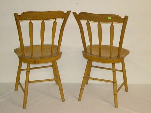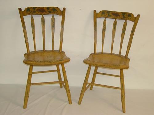 PR. NEW ENGLAND PAINT DECORATED ARROWBACK RABBIT EAR WINDSOR CHAIRS W/ SPLAYED LEGS, SHAPED CRESTS & PLANK SEAT IN MUSTARD PAINT W/ GREEN FOLIATE DECORATION (33 1/2" T X 18" W X 18" D) - WEAR TO PAINT, IMPERFECTIONS;