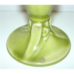 PAIR OF 1946 ROOKWOOD POTTERY CANDLEHOLDERS. Green glaze. Show signs of crazing. Marked on bottom with Rookwood mark and 6532. 3.75” h
