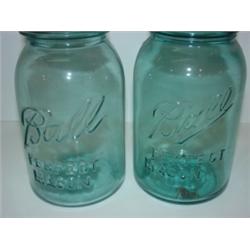 PAIR OF BALL MASON JARS WITH OIL SPOUTS. Glass jars are embossed "Ball Perfect Mason". Tallest measures 13" H