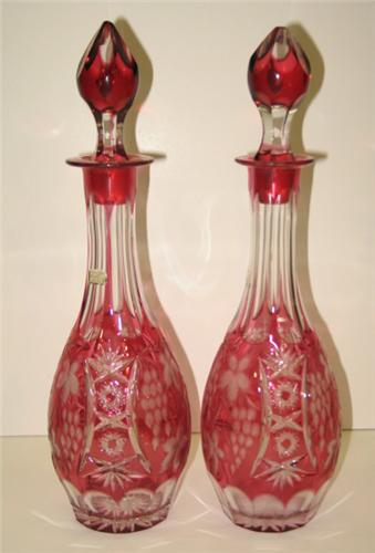 PAIR OF BOHEMIAN CRANBERRY CUT-TO-CLEAR GLASS DECANTERS WITH STOPPERS. Both are marked with partial sticker that reads "Made in Germany-U.S. Zone". 12.25" H