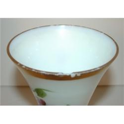 PAIR OF BRISTOL GLASS FLORAL DECORATED MANTEL VASES. Hand painted purple floral & gilt decoration. Slight chipping to top edge of rim on one vase. 9" H