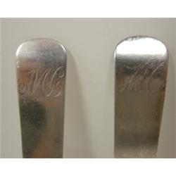 PAIR OF DELAWARE COIN SILVER TEA SPOONS. Marked on reverse of handles "H.J. Pepper". Monogrammed "MC" on front of handles. 5.75" L