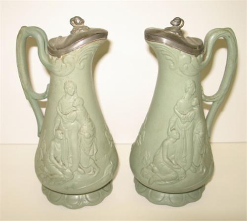 PAIR OF ENGLISH POTTERY CREAMERS. Both are decorated with relief scene depicting a sitting female and a female hugging another female. Both have metal ware lids. Both are marked on bottom with 1847 English registry mark and "Naomi and her Daughers-in-Law". 7" H