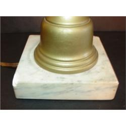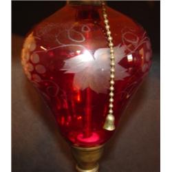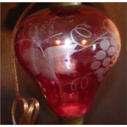 PAIR OF ETCHED CRANBERRY GLASS TABLE LAMPS. Bowls are decorated with etched grape and vine decoration. Marble bases. Electrified. White cloth shades. Both lamps are missing finials. One lamp has slight loss to color on bowl and leans slightly. 21" H