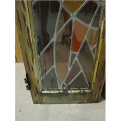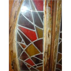 PAIR OF HALF-ROUND STAINED GLASS WINDOWS. Hinged and in original oak frame. Good condition. 57" H, 10.75" W framed