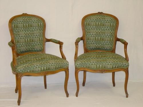 PR. OF LOUIS XV STYLE FRENCH PROVINCIAL FAUTEUIL BEECHWOOD ARM CHAIRS W/ FLORAL CARVINGS & CABRIOLE LEGS W/ GREEN UPHOLSTERY - REPAIRS, WEAR & IMPERFECTIONS