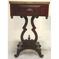 Pair of mahogany matching marble top nightstands. Have brown marble tops and lyre bases. Light surface scratching and wear to feet. 28.5" H, 17.75" x 16"