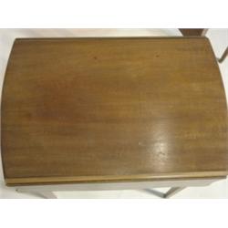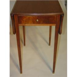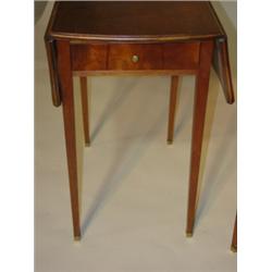 PAIR OF MAHOGANY SINGLE DRAWER DROP LEAF TABLES. Pembroke style. Brass castors on feet. Custom made. Dovetailed drawers. 24" H, 13.5" W, 27.5" W (fully extended), 21" L