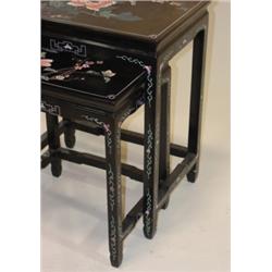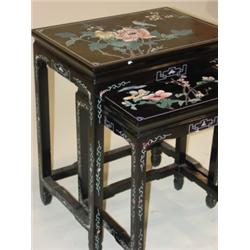 Pair of Oriental stack tables. Black lacquered and floral decorated. 25" H, 21" x 14.5".