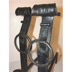 PAIR OF PRIMITIVE WROUGHT IRON ANDIRONS. Scroll tops. 16.75" H, 13" L