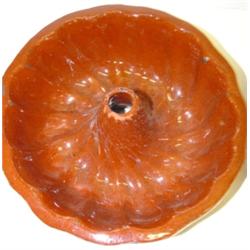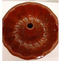 PAIR OF REDWARE CAKE MOLDS. One mold has cracking to exterior. One has chipping to top rim. 8.5" Dia., 3" H