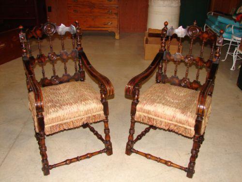 PAIR OF WILLIAM & MARY STYLE ARM CHAIRS. Woodstock, Vermont. Upholstered seats with fringe decoration. Elaborately turned feet. Both show signs of wear at seats. Finial at top of back on one chair has been repaired. 40” H to top of back