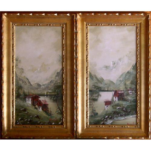A PAIR OF ORIGINAL MOUNTAIN LANDSCAPE OIL PAINTINGS<P>An elegant and highly decorative pair of landscape oil paintings from the third quarter of the 20th century. The misty mountain landscape depicts a poor country village rich in the natural beauty of its surrounding mountains and valleys, and is reminiscent in style of the great historical Chinese landscape paintings of centuries past. Perspective and composition of these paintings is superb, drawing the viewer directly into the scenery. <p>This well-executed pair of paintings is in excellent condition, and each is bordered by a carved and decorated gilt hardwood frame of the period. Each painting shows a different view of the same mountains from the vantage point of the artist, who has signed these paintings at the lower right, 'Monika'?. Dimensions are 29.5" by 17.5" overall, and both paintings are in excellent condition.