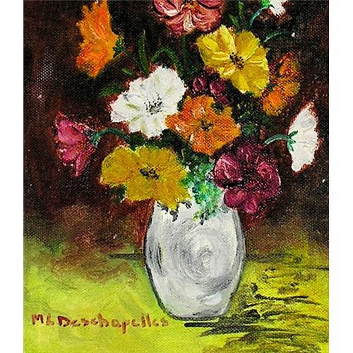 A charming and decorative pair of signed, colorful still life oil paintings of multi-colored flower arrangements in vases, one in an earth tone ceramic and the other in a white ceramic vase. Each has a rust-colored background with one fading from yellow and the other from green. Note that the matting is actually clear acrylic in an outer frame, not white (which is the wall color, allowing this pair of paintings to appear as if the color of the wall is the mat), with the inner frame floating on the clear ground. The artist's signature appears in both paintings at the lower left, 'M.L. Deschapelles'. Overall dimensions are 15.5" high by 13.5" wide, and condition is excellent; painted circa late 20th century.