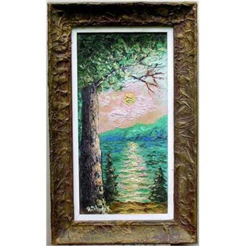 A PAIR OF MATCHING IMPRESSIONISTIC ORIGINAL SIGNED LANDSCAPE OIL PAINTINGS<P><BR>A lovely and unusual pair of landscape oil paintings in the impressionistic style, with impasto painting techniques and a rich color palette. One of the pair of paintings shows a sunset over mountains in the distance with coniferous trees, and the other shows a stream and small waterfall with a giant tree in the foreground, both in a beautiful wilderness area. The colors are shades of turquoise, green, browns, blues and pink sunset hues. The paintings are in excellent condition, and are signed by the artist at the bottom, 'Hitchcock'. They appear to have been done in the mid-20th century. They are framed in wood with a gilded handmade plaster relief finish.