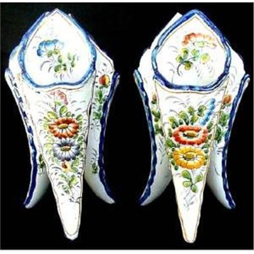 Fabulous pair of vases, made in Nevers, where French faience pre-dated Quimper , Rouen and the other areas famous for their majolica. Date to approx 1880. <P><P> Measurements: 7 3/4" tall. <P><P> Each vase is made of 3 curved 'horn'-shaped pockets, the narrow, conical bases forming a tripod. The surface of all parts is beautifully handpainted with sprigs of flowers, bordered by bright blue and golden orange. Delicate and masterful painting. <P><P> Marks: each piece has handwritten marks: a T covered by a C, NEVERS and the number 4 or 14. <P><P> Condition: very good. No cracks or chips. One or two tiny spots where the glaze did not fully cover the clay - original to the pieces.