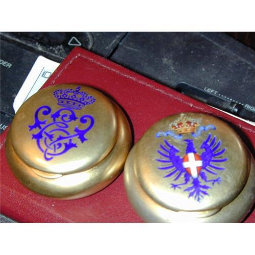 THE SECOND BOX HAS THE CROWNED INITIALS OF THE MONARCH, VICTOR EMMANUEL, DONE IN BLUE ENAMEL.