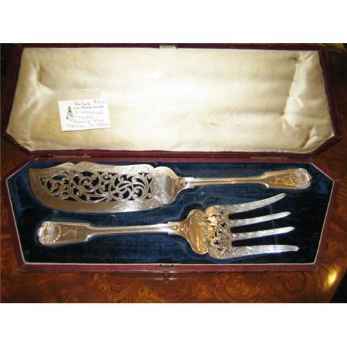 BEAUTIFUL PAIR OF HAND CHASED OPEN WORK ENGLISH ELECTRO PLATED FISH SERVERS IN ORIGINAL LEATHER CASE. THE SERVERS HAVE A SCROLL SHELL ON THE FRONT OF THE HANDLE AND THE TOP OF THE BACK OF BOTH THE KNIFE BLADE AND THE BACK OF THE FORK. THEY ARE ENGRAVED WITH ARMORIALS ON EACH HANDLE. THEY ARE IN VERY GOOD CONDITION AND WERE MADE CA 1860