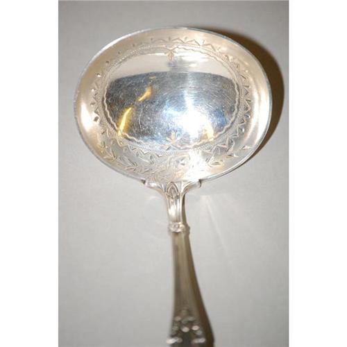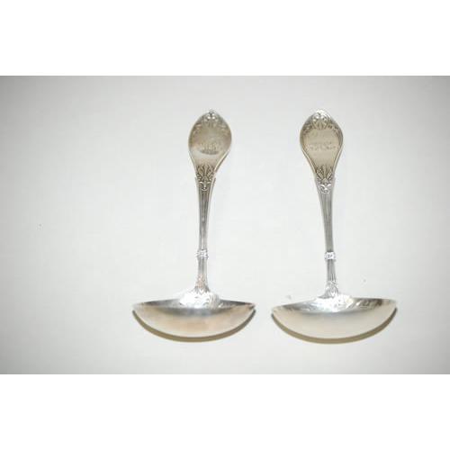 PR. VICTORIAN STERLING SAUCE LADLES - (2) 6 3/4"<BR>19TH CENT. STERLING SAUCE LADLES W/ BRIGHT CUT DESIGNS<BR>IN BOWL-PATTERN UNKNOWN, MARKED STERLING ON BACK<BR>(4 TROY OZ.) - MINOR WEAR & IMPERFECTIONS