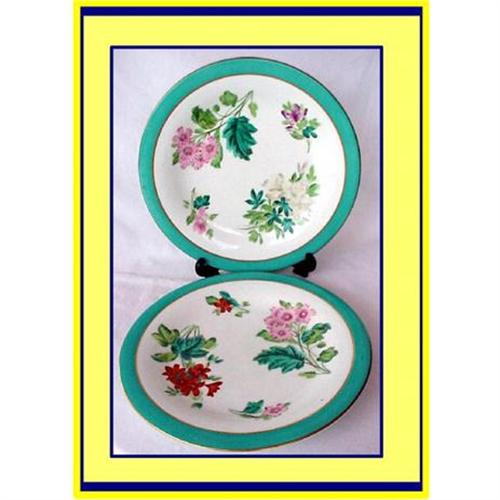 A pair of Worcester part transfer, mostly hand painted plates, C1868, depicting flowers on a white ground. Each plate is 9 1/2inchses in diam. A turquoise border surrounded by gold. White ground is handpainted with sprigs of red, white and pink flowers and leaves in shades of green. Impressed Worcester marks underneath - very difficult to photograph. Condition very good - no chips/cracks/ and paint is fresh and clear.