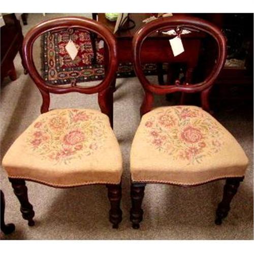 Beautiful Pair of Walnut Victorian side chairs. Original horsehair still inside the seat. The covers are hand stitched with beautiful flowers and in very good condition, no stains or tears! There is a small piece of wood trim missing from the little loop on the back of one of the chairs and also a small piece missing from the cap of one of the feet, other than that the chairs are in very good condition for the age. The height of the seat from the floor is 17". Exquisite and still quite comfortable!