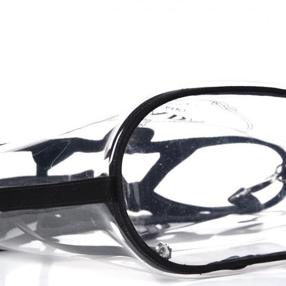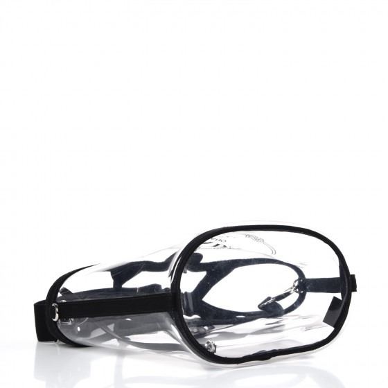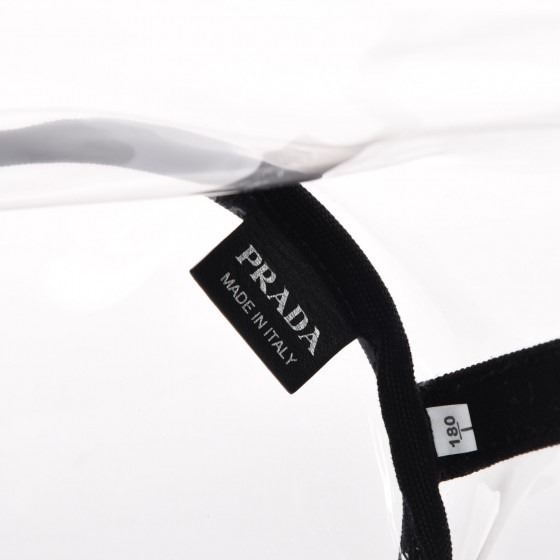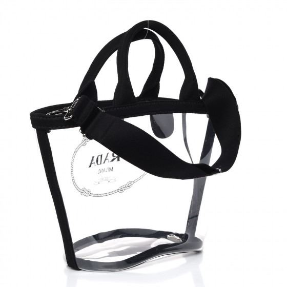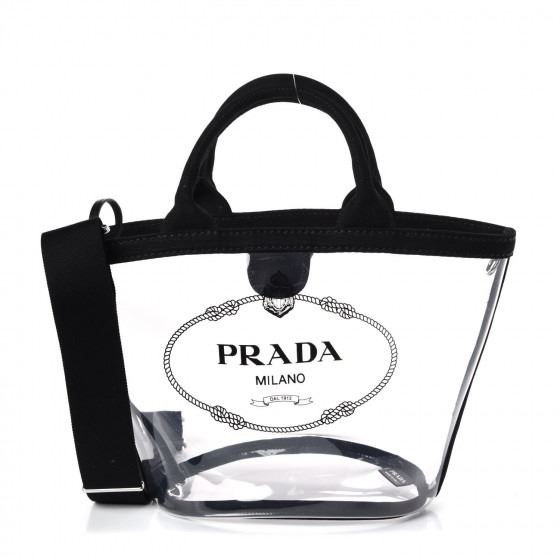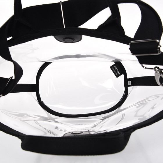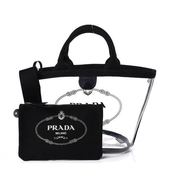 Description: PRADA Plexiglass Hemp Small Canapa Shopper Tote Black. crafted of transparent vinyl and has black fabric trim with a black Prada logo on the face of the bag. The bag features tall black fabric handles, an optional adjustable shoulder bag and polished silver hardware. The top opens to a spacious clear interior with a black fabric pouch that can be removed.