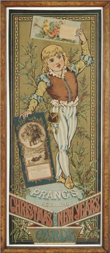 PRANGS CHRISTMAS & NEW YEARS CARDS LITHOGRAPH. Early stone lithograph from the Louis Prang Company of Boston, Mass. This beautiful poster features separate Christmas and New Years card samples that have been inserted under the die cut fingers of its blonde haired messenger. This rare example comes to us descended directly from Louis Prang himself through his living grandson and has been in the family since its printing. A photocopied letter of provenance is included documenting the family connection stating the ad "came to me through my grandmother, daughter of Louis Prang[who] starting in 1875, put out the first Xmas cards in the U.S. They were so successful, the U.S. government issued a stamp in 1975 celebrating the 100th anniversary. This piece was exhibited at the Smithsonian in 1995." IMAGE SIZE: 10 1/2" w x 27 3/4" h. CONDITION: Very good to excellent with some light age toning to white areas. 1-5881 PF