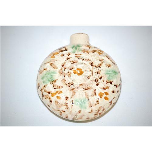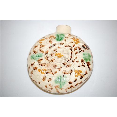 PRATTWARE POCKET FLASK W/ EMBOSSED CIRCLES W/ RAYS DECORATION & SPATTER GLAZED IN GREEN, MUSTARD & BROWN (4 1/2" T X 4" W) - WEAR, GLAZE CRAZING, TINY RIM CHIPS, IMPERFECTIONS;