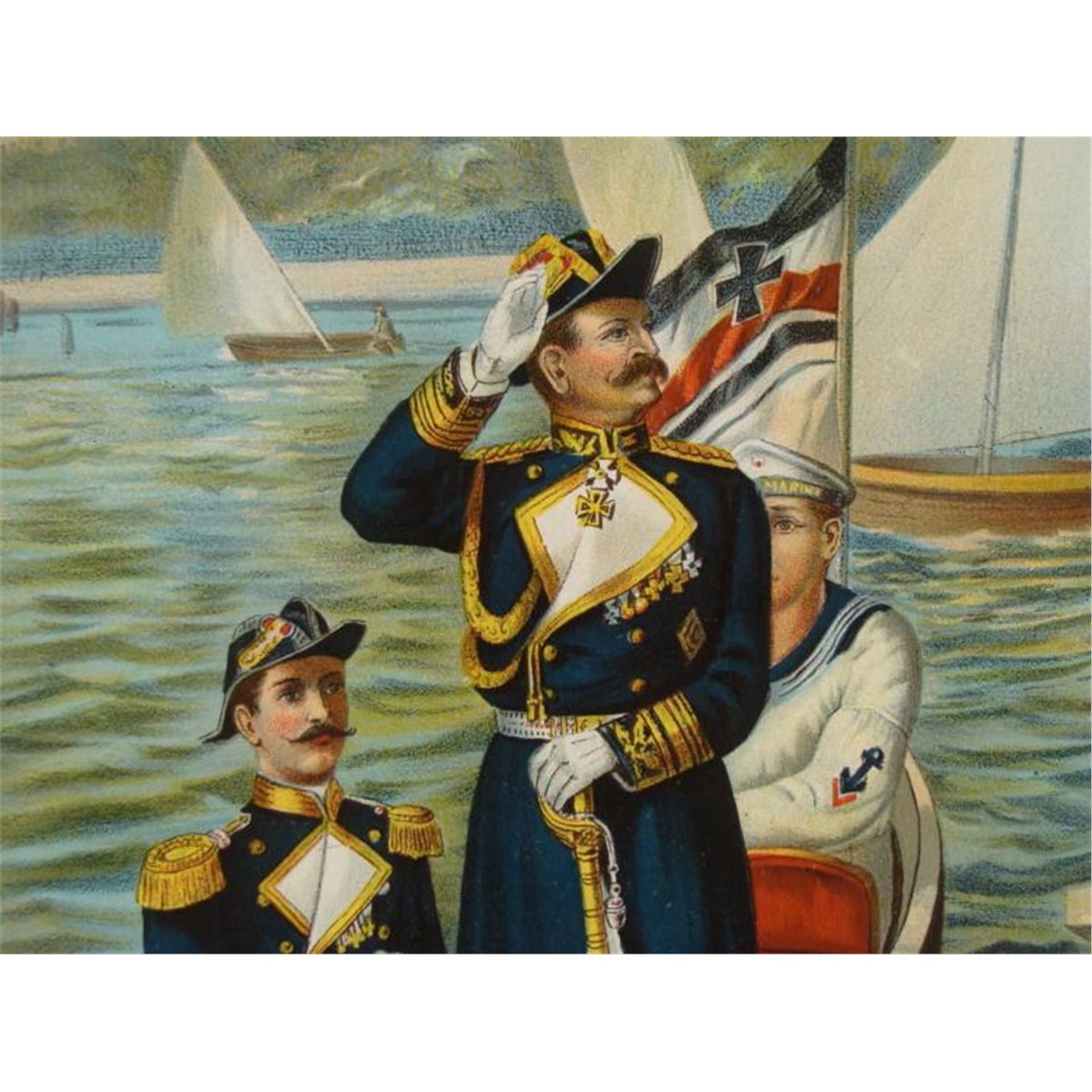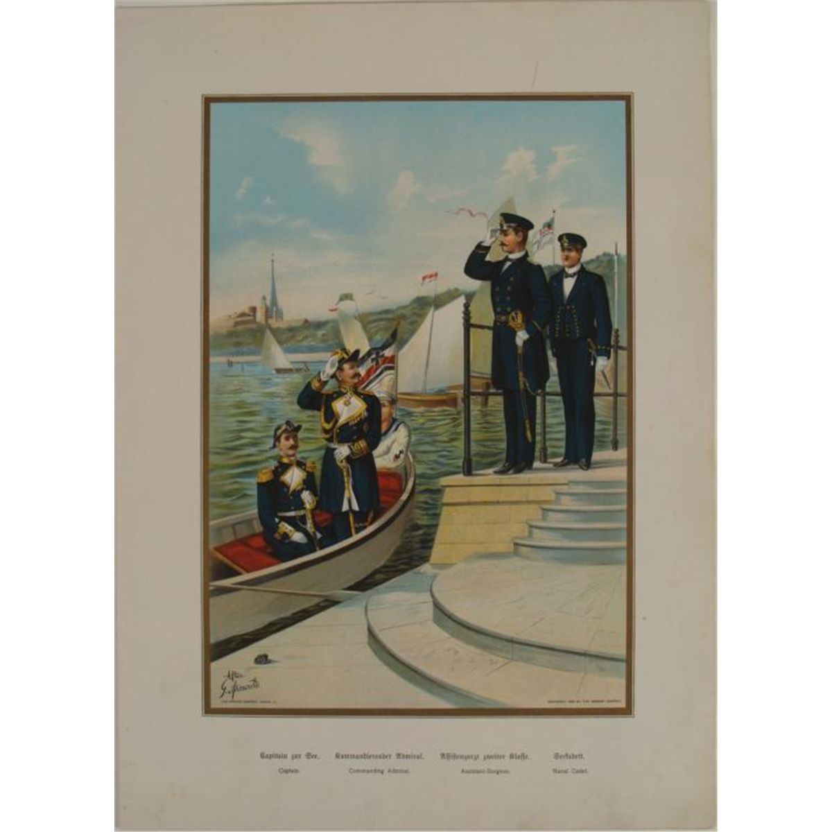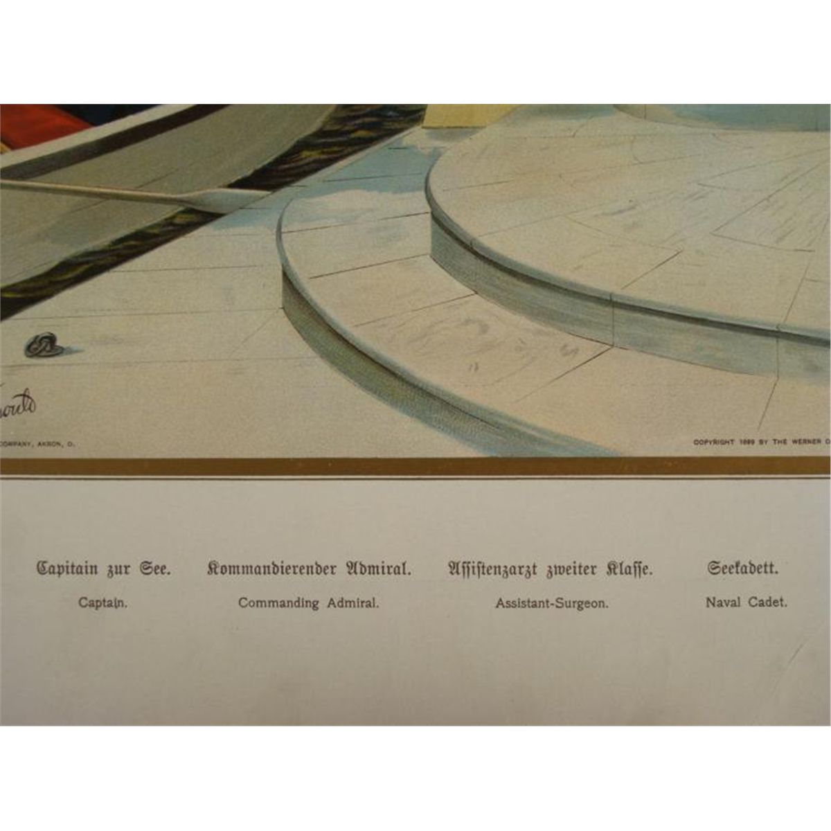 PRE-1900 GERMAN NAVAL PRINT-SHOWING ADMIRAL & OTHER RANKS IN FULL DRESS * 12 1/2 x 17 1/2" COLOR PRINT OF SEVERAL GERMAN IMPERIAL NAVY RANKS IN FULL DRESS UNIFORMS AT A SCENE AT SEA--INCLUDES COMMANDING ADMIRAL WITH NAVAL FLAG ON BOAT-CAPTAIN-ASST SURGEON AND NAVAL CADET- COPY WERNER CO 1899. -GREAT HISTORICAL PRINT-NEEDS FRAME *