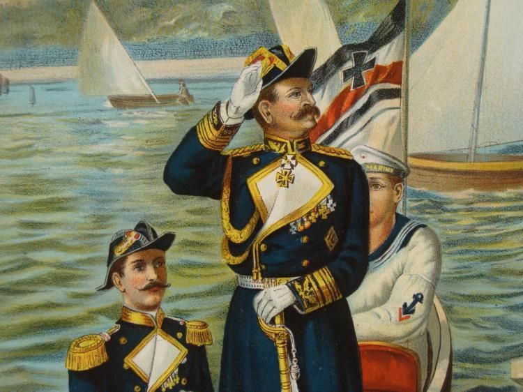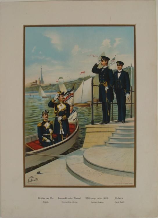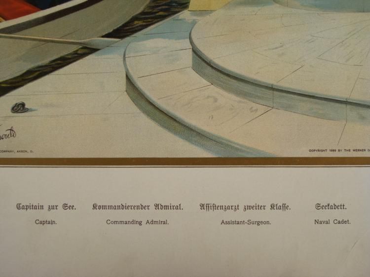 PRE-1900 GERMAN NAVAL PRINT-SHOWING ADMIRAL & OTHER RANKS IN FULL DRESS * 12 1/2 x 17 1/2" COLOR PRINT OF SEVERAL GERMAN IMPERIAL NAVY RANKS IN FULL DRESS UNIFORMS AT A SCENE AT SEA--INCLUDES COMMANDING ADMIRAL WITH NAVAL FLAG ON BOAT-CAPTAIN-ASST SURGEON AND NAVAL CADET- COPY WERNER CO 1899. -GREAT HISTORICAL PRINT-NEEDS FRAME *
