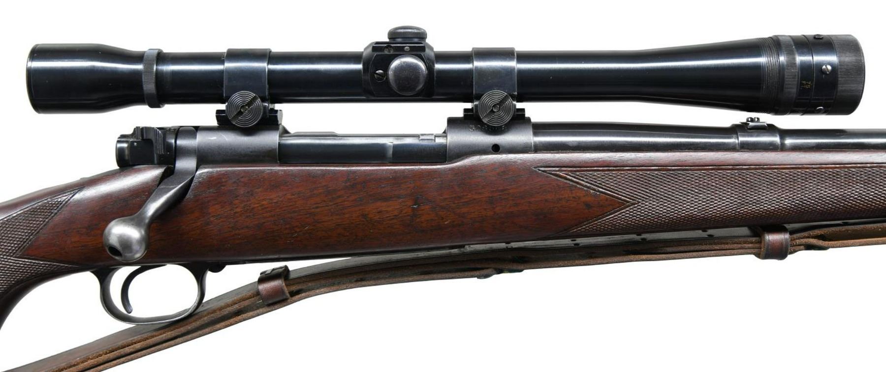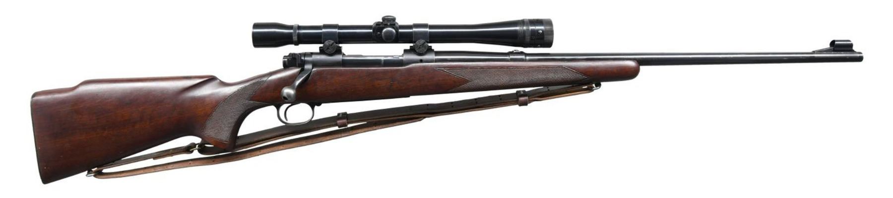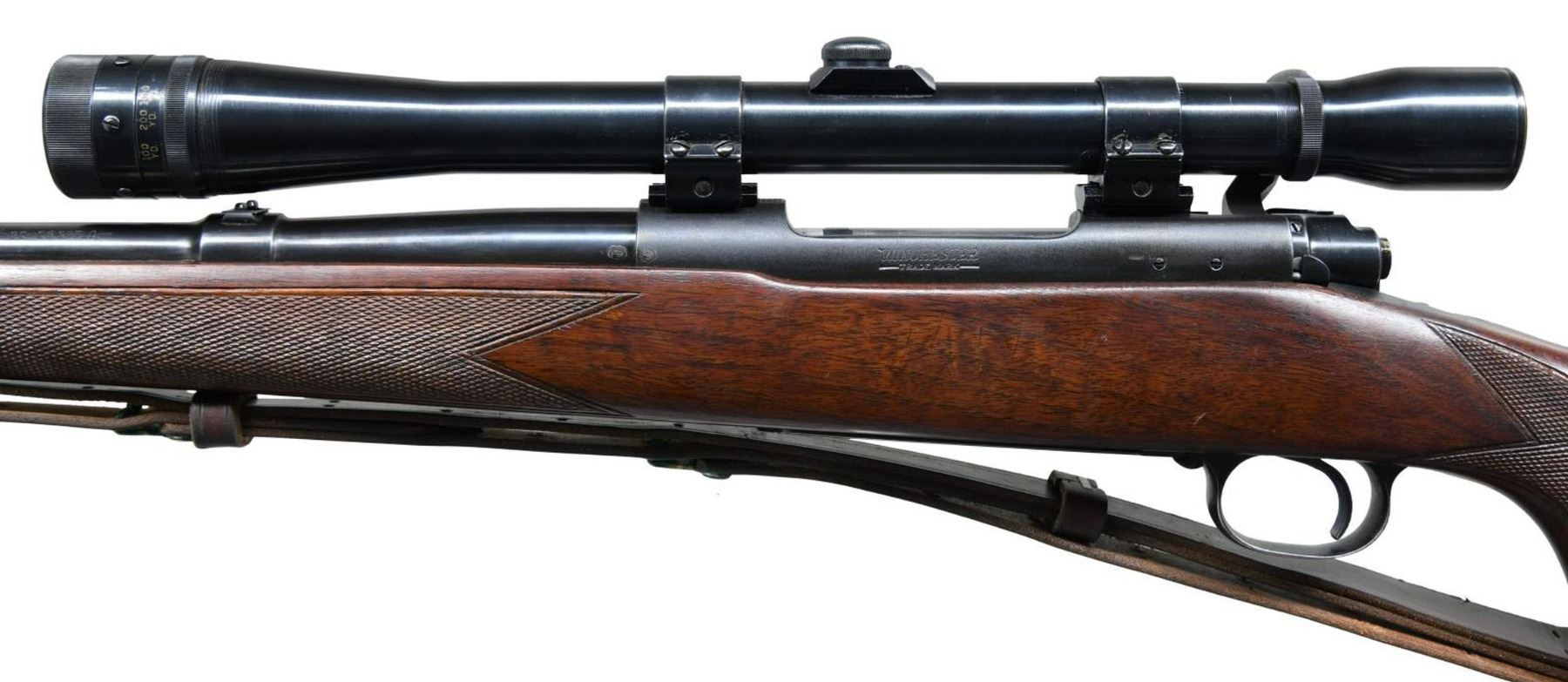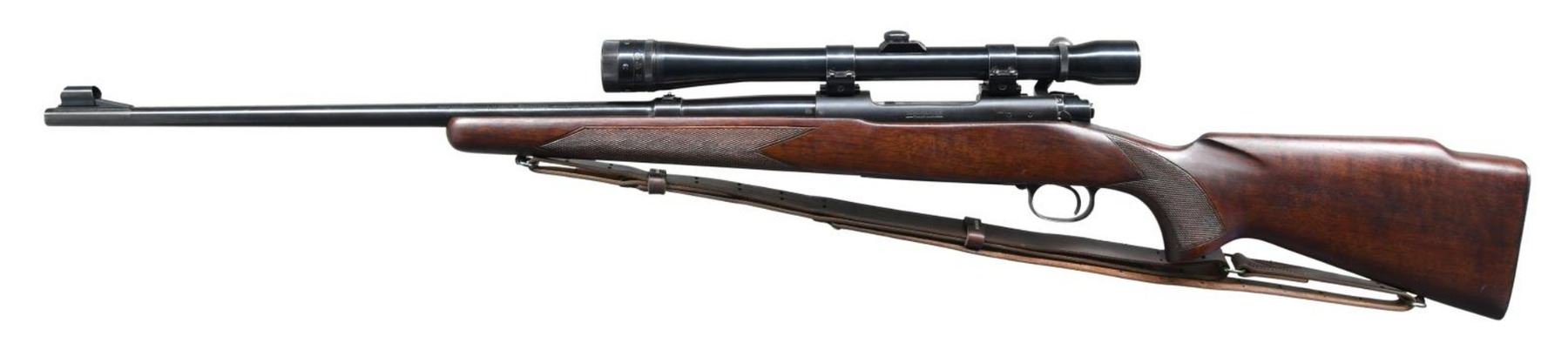 Cal. 30-06. S# 328588. Bbl 24". Model 70 chambered in .30-06 Springfield manufactured by Winchester in 1955. Standard factory stampings on barrel and receiver. Matte blued finish on receiver, with standard bluing on barrel, trigger guard, and floorplate. 1 piece checkered wood buttstock with checkered steel buttplate and brown leather sling. Receiver is mounted with a Weaver K10 scope. CONDITION: metal components retain the majority of their original factory blue finish, exhibiting some spots of mild wear that show through to gray patina, with some scattered superficial marks from handling and storage. Very bright bore, exhibiting a couple small spots of light pitting, and retaining well defined rifling throughout. Stock show some scattered nicks and a few minor impressions from storage and handling, but is otherwise very good overall. Scope optic is cloudy. (23-2586/MLW). CURIO. $600-900.