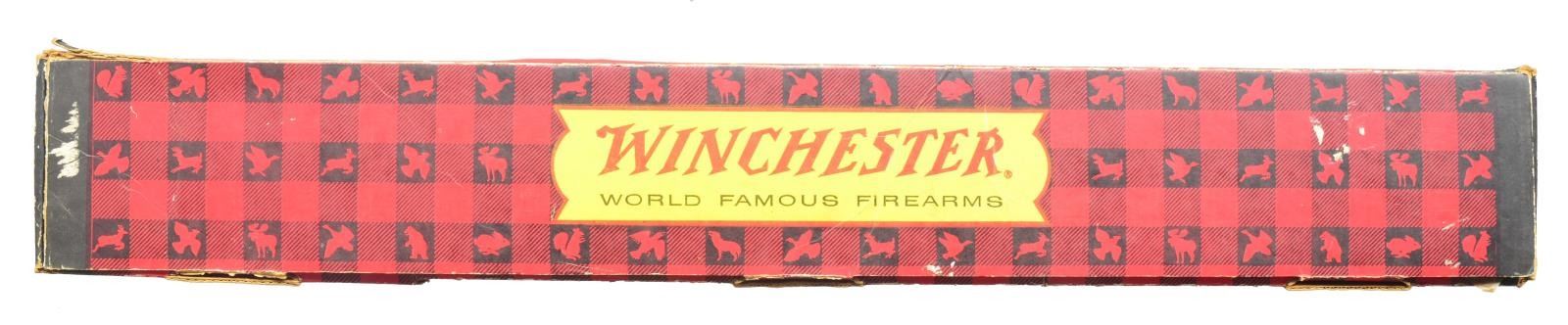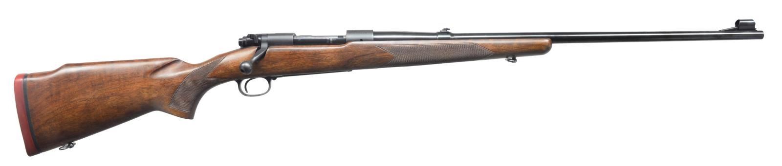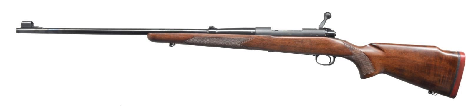 (ALASKAN) W/ BOX. Cal. .338 Win. Mag. S# 498441. Bbl. 25" medium weight standard bbl. has all correct Winchester info. on left side & is fitted w/ flip down rear sight & white bead in front ramp. Pre 64 matte blued Model 70 action accepts 3 rds. of this large bodied cartridge in mag. which has steel hinged floorplate. Lightly figured American walnut Monte Carlo stock measures 13 3/4" over red Winchester pad. Stock features sling loops & standard checkering at grip & forend. UNATTACHED ACCESSORIES: red & yellow checkerboard box w/ end label numbered to this rifle in ball point pen. Box contains pocket hunter’s guide, hang tags, instruction book, & black leather sling. CONDITION: very fine w/ evidence of moderate use. Bbl. & action retain over 90% original blue. There is evidence of scope block removal on top of action. Bottom metal has considerably silvered on sides of floorplate & trigger guard bow. Stock w/ oil added to original finish over some minor marks. Sharp shiny bore. Mechanically fine. Box is good w/ some chips on edges, end label clean & clear. (20-4091/MGM). CURIO. $2,000-3,000.