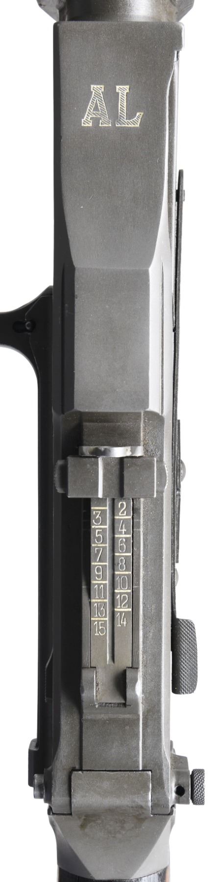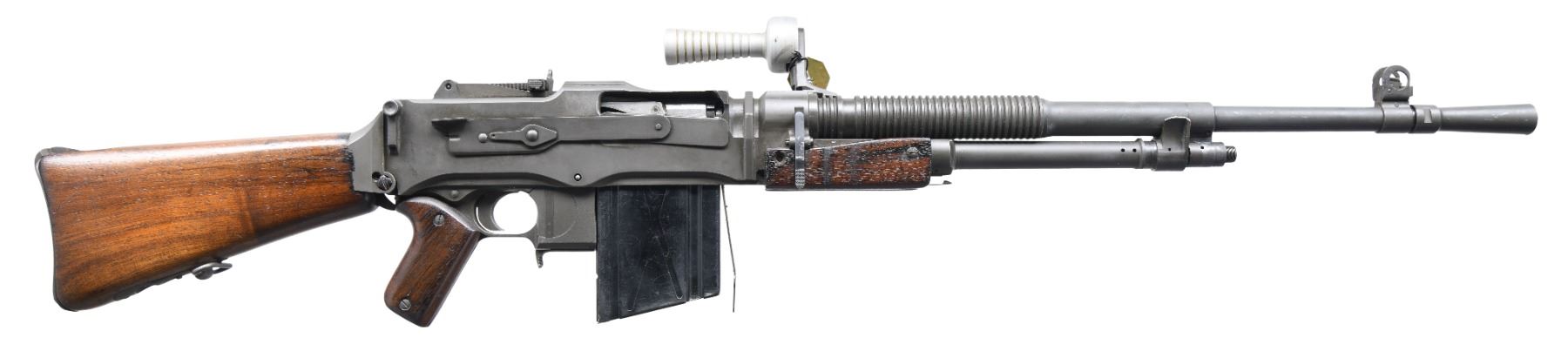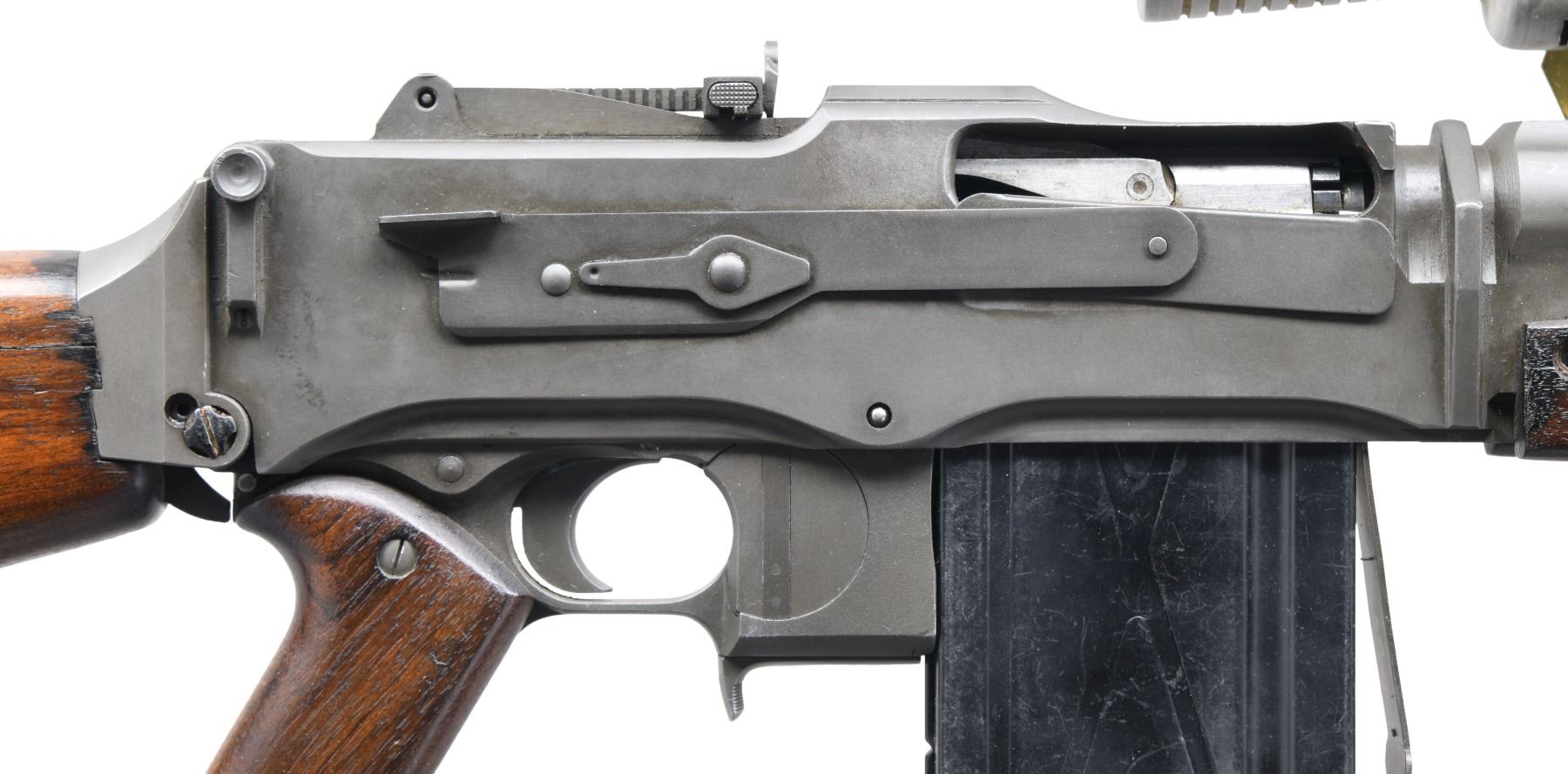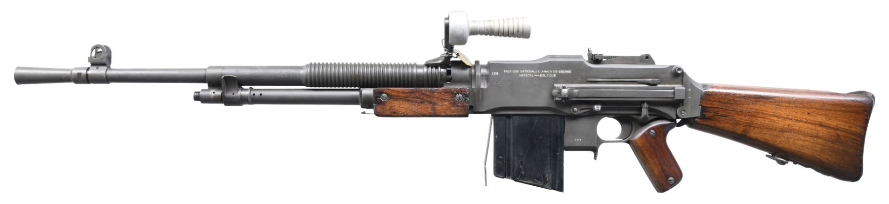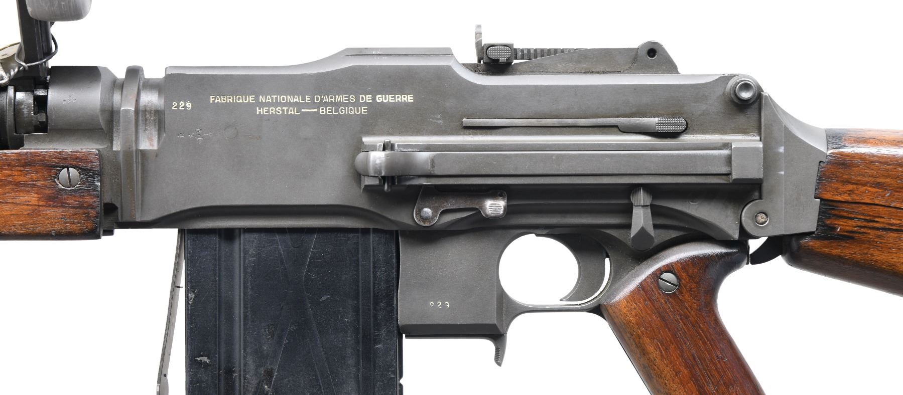 LUXEMBORG CONTRACT FN MODEL D . Cal. 30-06. S# 229. Bbl. 25" over flash hider. Introduced in 1932, the FN Model D was the last version of the legendary Browning Automatic Rifle. It boasts a detachable barrel & eased takedown due to a hinged butt stock, making the rear of the receiver accessible. This particular example was manufactured in Belgium for sale to Luxembourg, and marked as such w/ the "AL" marking on the top front of the receiver. Unlike the traditional BAR, the FN Model D has a pistol grip, similar in aesthetics to the Colt Monitor. Above the pistol grip is the safety / selector marked "M - R - S". The internal design utilizes a rate reducer allowing full auto function at a slower cyclic rate. The "S" position is "Safe", the "R" position is "Slow" & the "S" position is "Fast". Belgium proof marks on left side of receiver. Matte parkerized finish on exposed metal surfaces. 2 piece wooden forend w/ matching 2 piece pistol grip panels & shoulder stock w/ folding shoulder rest. Shoulder stock also inlet for rear mounted monopod. Serial number on trigger group "229" matches receiver number. Top mounted carry handle that assists w/ barrel changes. Protected blade front sight. Rear peep sight adjustable from 100 meters to 1500 meters. Detachable barrel has 30 cooling fins forward of chamber. Barrel marked w/ British & Belgian proof marks. MAGS: 7 steel 20 rd. CONDITION: Finish complete & consistent w/ very little outward sign of use. Finish coverage unusually complete w/ some light thinning in areas of mechanical intervention & on some high spots. Bipod & front gas port absent as well as rear right forend screw. Wood furniture is in nice condition but shoulder stock has a few 3.5" hairline cracks that don't appear to have any structural significance. Bore is bright w/ strong rifling. Fire control mechanism appears to function correctly when cycled by hand. PRE-86 DEALER SAMPLE (KEEPER). NATIONAL FIREARMS ACT MG REQUIRING BATF TRANSFER BEFORE TAKING POSSESSION. YOU MUST BE A CURRENT NFA/SOT DEALER IN ORDER TO TAKE POSESSION OF THIS FIREARM. PROVENANCE: From the Lifelong Collection of Brian Linde. (03-1838/JZ). MODERN.CLASS III. $8,000-12,000.