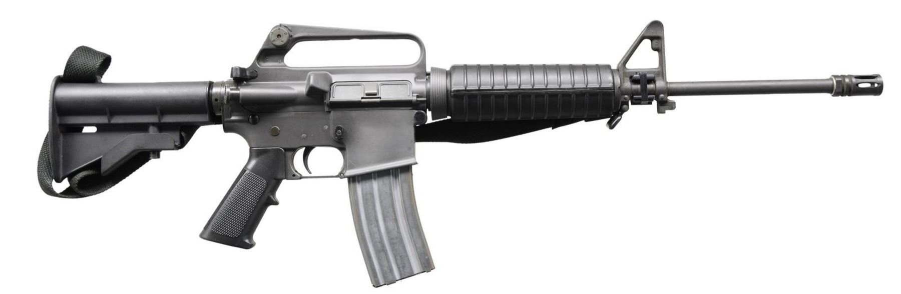 Cal. 223. S# SP339313. Bbl. 16". Mfg. Early 1990's. Threaded barrel terminated w/ A2 flash hider. Barrel marked "C MP 5.56 NATO 1/7". Upper receiver marked "C H" indicating Harvey Aluminum subcontracting, w/ round forward assist & brass deflector. Slab side lower receiver marked "COLT'S FIREARMS DIVISION / COLT INDUSTRIES / HARTFORD, CONN / USA" on left side above trigger & COLT / AR-15A2 / CAL 223 / SPORTER II" above serial number on mag well. Protected post front sight / gas block / bayonet lug. 6" A2 carbine handguards retained w/ tapered delta ring. Dual aperture rear peep sight in carry handle. 2 position, collapsible, black plastic shoulder stock. Left side single point sling adapter at front sight. Black, 2 point nylon sling. Front takedown pin replaced w/ removable push pin. MAGS: (2 total) 1 aluminum 30 rd. & 1 aluminum 20 rd. w/ floorplates marked "COLT'S FIREARMS DIVISION / COLT INDUSTRIES". CONDITION: Complete & consistent finish on receivers w/ some thinning on high spots & light drag lines typical of range use. Upper receiver finish a little darker than lower. Bright bore w/ descent rifling. Fire control mechanism appears to function correctly when cycled by hand. (23-5033/JZ). MODERN. $1,200-1,800.