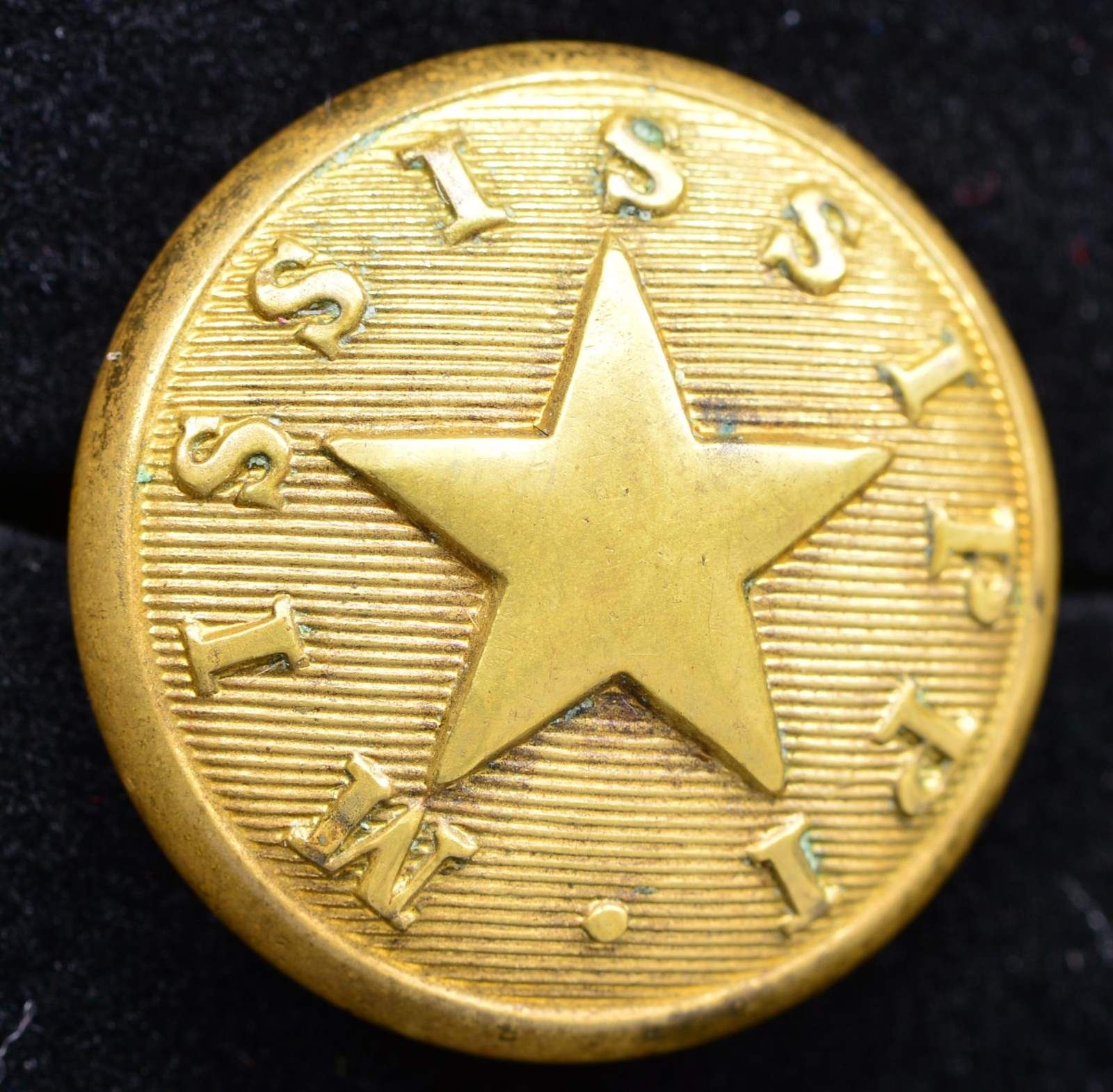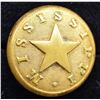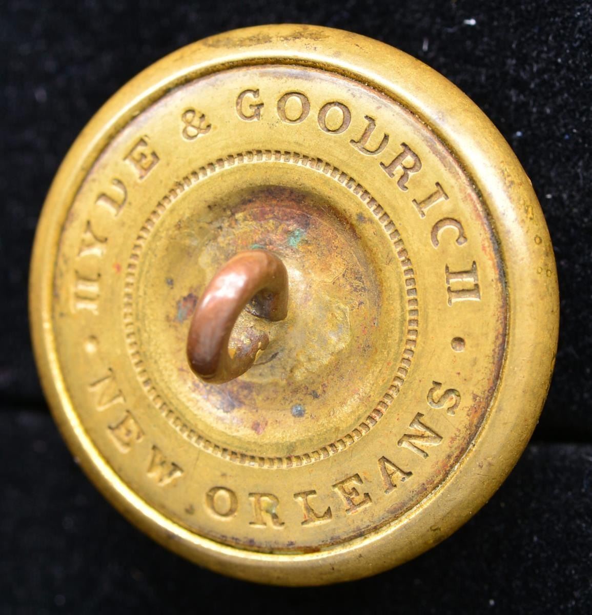An excellent example of a pre-war Mississippi button produced for Hyde & Goodrich of New Orleans by Scovill of Waterbury, Connecticut. Many pre-war Mississippi were utilized by Confederate forces during the Civil War. Albert # MP-1-A. Face depicts a central star surrounded by the word, "MISSISSIPPI . " all on a lined field. The reverse reads, "HYDE & GOODRICH . NEW ORLEANS . ". Full straight shank. CONDITION: button has a beautiful brass patina with original gilding in protected areas. (02-17704/BF). $2,500-3,000.