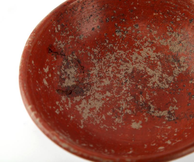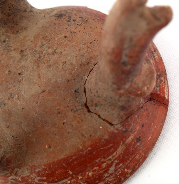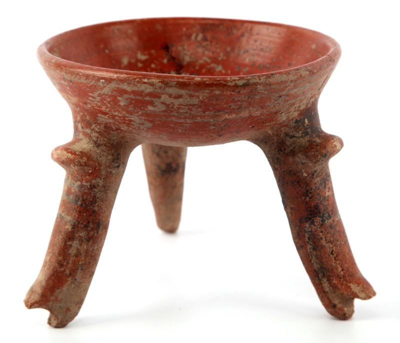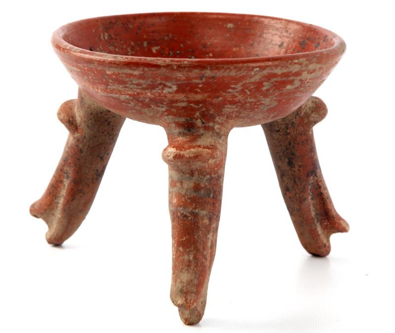 Pre-Columbian polychrome Aztec zoomorphic tripod bowl from Mexico, c. 1200 - 1400 CE. Legs are executed in the form of crocodilian heads, which measure about 3.5 inches, and extend an inch beyond the edge of the 5.5 inch diameter, 1.5 inch deep bowl. Bowl shows repair where one leg has been re-attached, and beginning of a fracture showing in another.