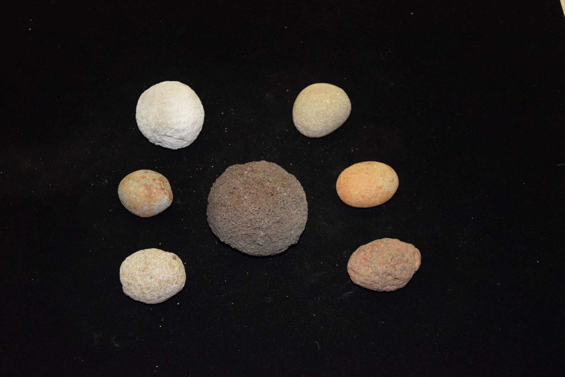 PRE-CONTACT HAWAIIAN STONES, 5 SLING STONES, 2 BALL THROWING STONES (7 PCS)