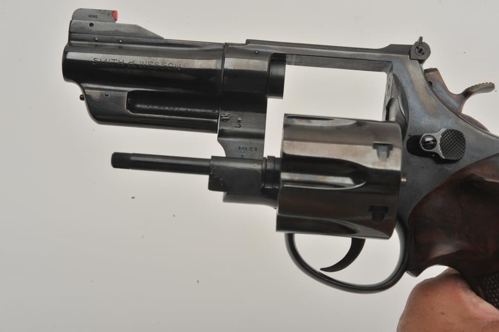 From the collection of Jerry Lewis – consignment by his estate – “Pre Model 27”-357mag D.A. (revolver)” with 3 ½ BBL king sight added, custom wood grips, re blued to excellent, mechanically excellent with finebore. (NO PPT). Est:1000-2000